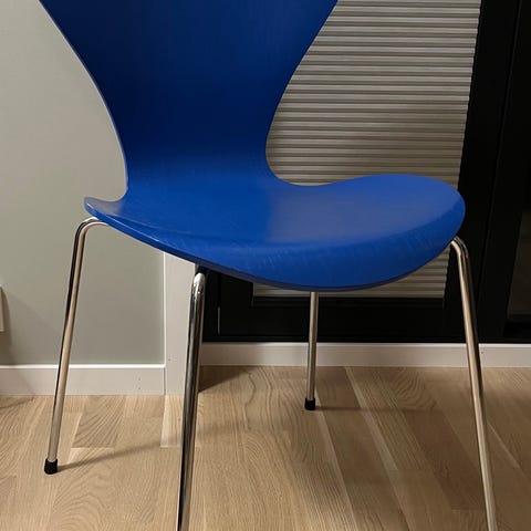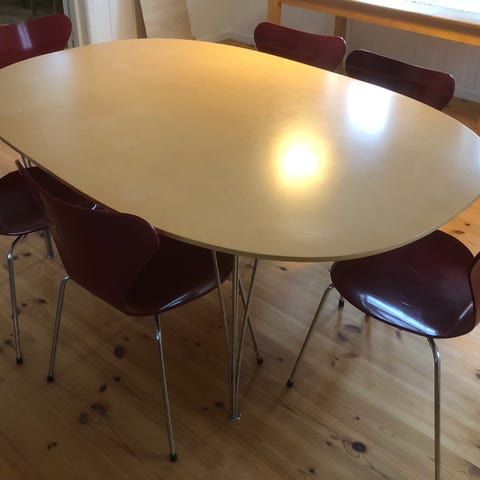 Selger 6 stk klassiske 7er spisestoler i sort finer og krom. Stolene er i god vintage stand.. har div bruksmerker.. rygg på alle er faste. Stolene har jeg kjøpt brukt en gang i tiden.. tror de opprinnelig var fra slutten av 90 tallet. De har ingen merking.. Jeg vet ikke om de er orginale eller kopier. Det finnes orginale stoler uten merke på koppen.. etikett kan med tiden ha falt av.. ikke så rart etter 30 års bruk. Selges som de er.