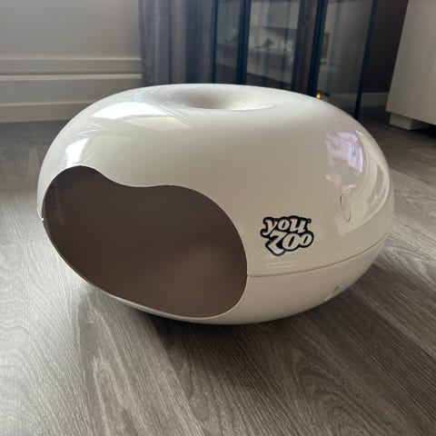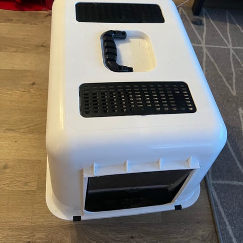 Curver kattedo med lukket design med en fasong som gjør at den passer i hjørner.