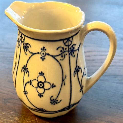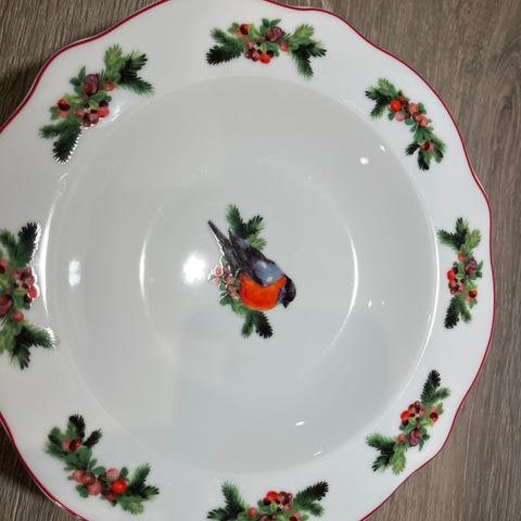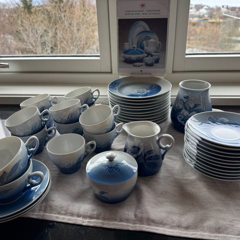 4 middagstallerkener, 4suppeskåler, 10 frokosttallerkener, 9 asjetter og 10 kopper. Alt i god stand.