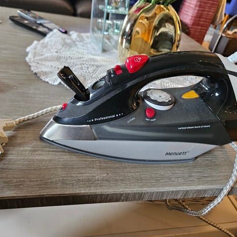 Senz strykejern i rød og hvit farge med ledning. Passer til stryking av klær og tekstiler.