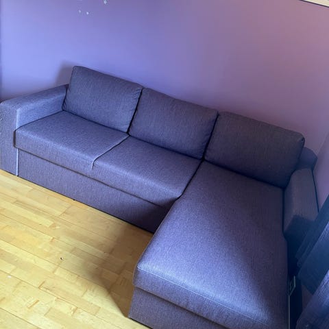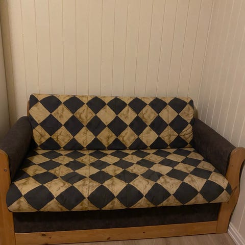 Treseter sovesofa. Veldig god å sitte i. Godt brukt . På den ene armlene er det merke etter hjemme snekret koppholder. Sitte merker etter bruk. Når sofaen er slått ut så er dybden 147 cm. Selges med overmaddrass. Målene på overmaddrassen er 135x 190. Må hentes