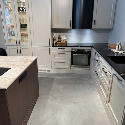 Moderne kjøkken fra 2014 med sorte matte fronter og hvit benkeplate. Kjøkkenet har integrert vask og koketopp med vifte. samt kjøkkenøy med oppbevaringsskap. Det medfølger fult kjøleskap , to ovner (en ovn og en dampovn) , mikro (med ovnfunksjon), oppvaskmaskin og kaffemaskin om ønskelig. Varmeskuff og souvide skuff. Kjøkkenet er Hamran og hvitevarer fra AEG. Blandebatteri er med Quooker funksjon (kokende vann)