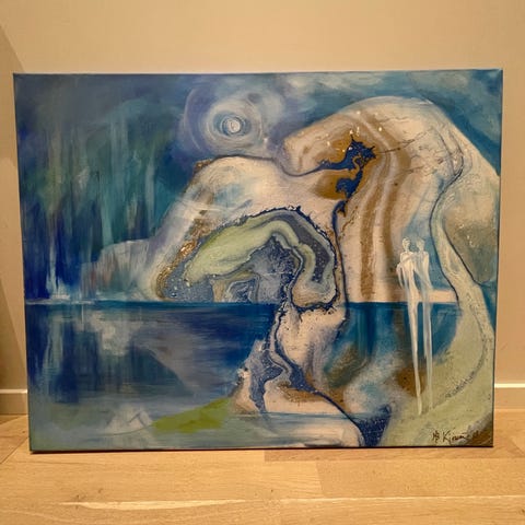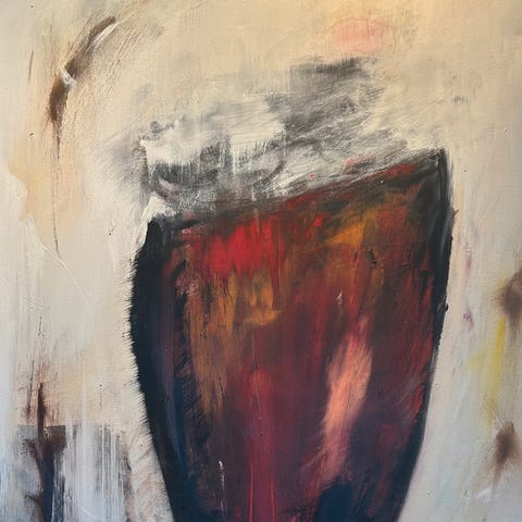 Maleri med abstrakt motiv som viser en kombinasjon av farger og former. Bildet inneholder elementer som kan tolkes som natur og arkitektur, med en ramme rundt. Med ramme er størrelsen 83cm x 63cm.