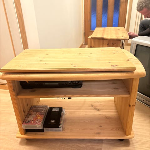 Tv-benk Bestå gis bort mot rask henting. Dørene følger ikke med. Bakplatene på benken er skjært ut.
