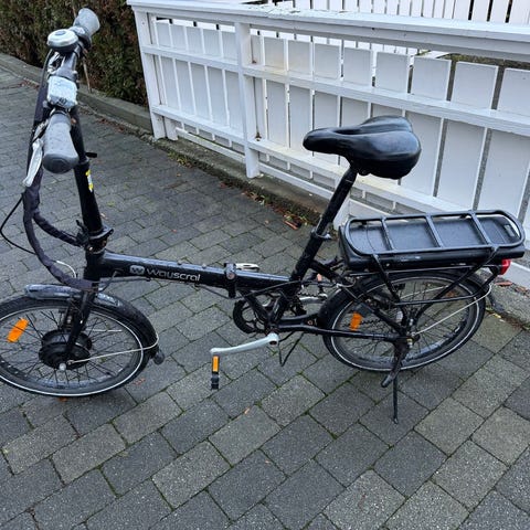 Trek elektrisk sykkel for unisex bruk. Sykkelen har en kompakt ramme med svart og røde detaljer. Den er utstyrt med elektrisk motor og standard sykkelkomponenter som sete, styre og bremser.trenger en ny batteri ellers alt perfekt