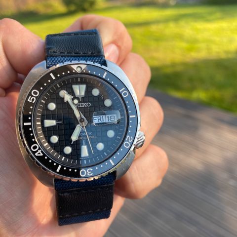Nydelig Seiko selges. Dette er den legendariske Turtle med Pepsi-bezel. Klokka har blitt oppgradert med en god gummireim fra ClockworkRepublic med endlinks. Ser bra ut, og er adskillig mye mer komfortabel enn den originale reima. Ny reim kosta cirka 1000kr.
