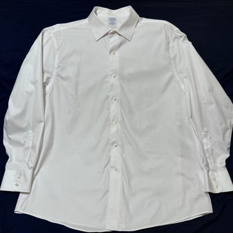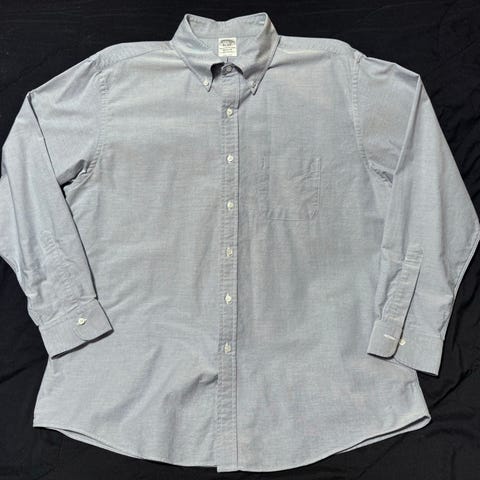 Herreskjorte fra klassiske Brooks Brothers selges. Skorten er i størrelse XXL/45, og er klassis amerikansk oversize. Den har omtrent samme passform som Eton Classic fit i størrelse 45/46. Skjorten er blå, med bomull og noe spandex for en helt minimal strech. Den har brytslomme, dobbel knapp på ermet, button-down krage og knappestolpe, og lange ermer.