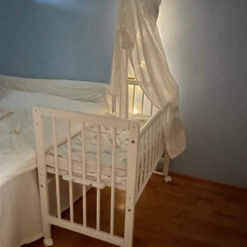 Lite brukt bedside crib. Følger med ubrukt madrass hvis ønskelig, fra Barnas Hus (kjøpt september 2025). Lille ville ikke sove annet sted enn i armkroken min, så senga hennes har støtt ubrukt siden fødsel. Dermed helt ny madrass. Justerbar i høyden, festes med skruer, bein med hjul som kan låses. Madrassen kommer helt inntil sengen.
