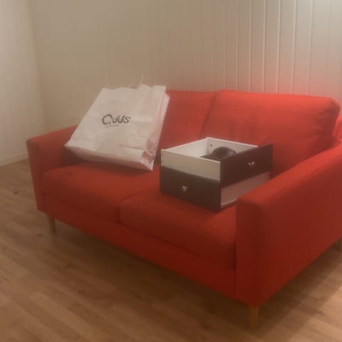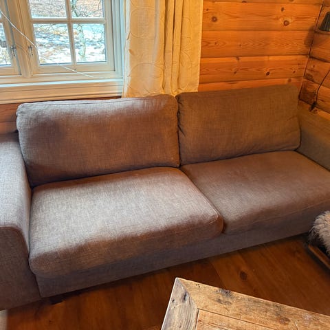 Alle putetrekk og armlene beskytter kan taes av og vaskes. Fast sitte-komfort. Noen løse tråder på ene armlenet (katteklor). Bildene er misvisende i fargen, den er mer lys blågrå enn grå. Må hentes. Gies bort da jeg har liten plass og trenger en mindre sofa.