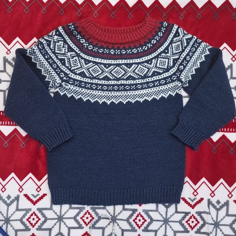 Pent brukt mariusdress, hjemmestrikket i blå, rød og hvit ull. Strl 80-92 ca. 250kr.
