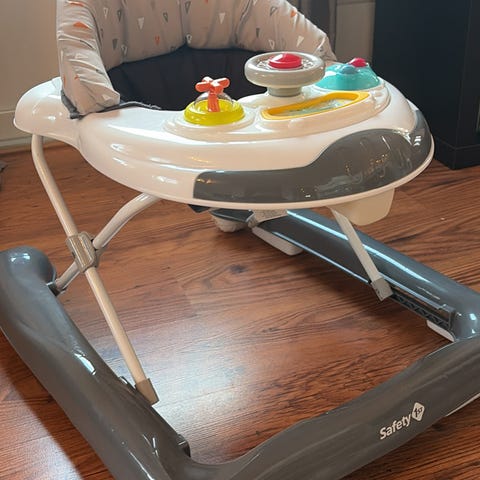 En gåstol som lager lyd og kan kjøres rundt av barnet, kan legges sammen.