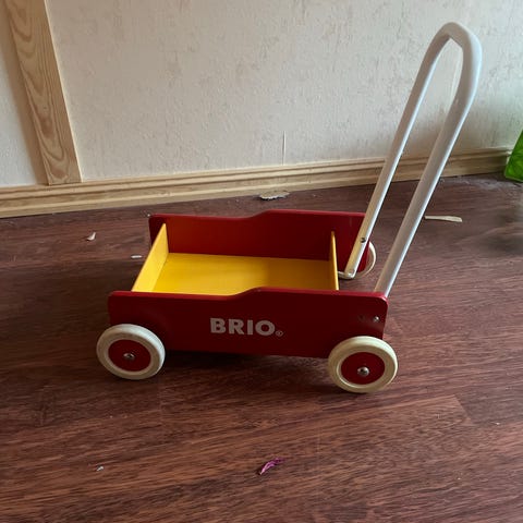 BRIO barnevogn i tre, rød og gul farge med hvite hjul. Egnet for barn som lekekjøretøy eller til å transportere leker. Designet for å være stabil og enkel å manøvrere.