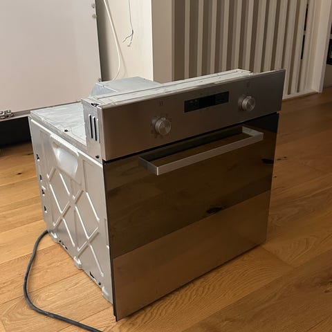 Stekeovn gis bort. Målene på den hvite ramme i front er 595x595mm. Dybde ca 55 cm. Den er ikke rengjort skikkelig. Passer for integrering i kjøkkeninnredning med begrenset plass.