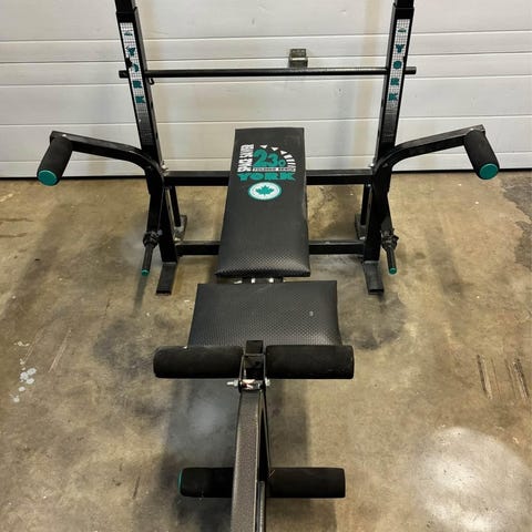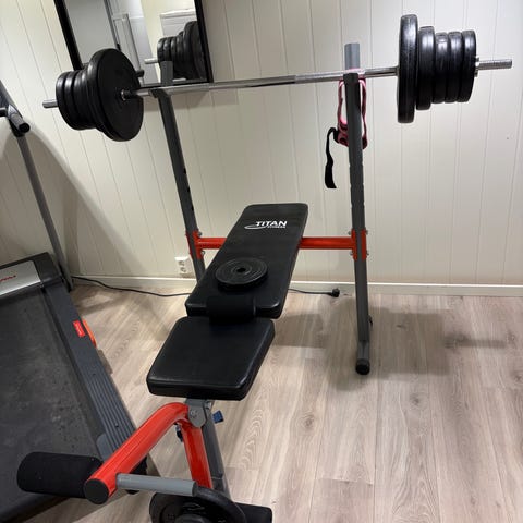 Kayoba treningsbenk med tilhørende vektstang og vektskiver i ulike farger. Benken har justerbar ryggstøtte. Egnet for styrketrening og ulike øvelser hjemme. Passer for bruk i treningsrom eller hjemme.