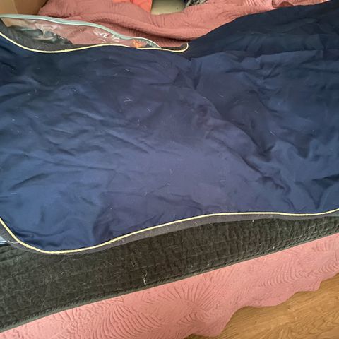 Passer til de kaldeste dagene/nettene el under regndekken på vinter. Spennene foran er slitt men fullt mulig å feste de. Ene er krok og andre er spenne.