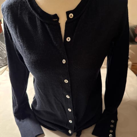 Part Two ullskjørt i en sprettete sort/grå ulltekstil (70 prosent ull). Størrelse 44 (UK 18). Skjørtet har en ganske rett fasong, lengde og breddemål mål framgår av bildene. Skjult glidelås bak.