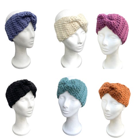 Hvitt pannebånd har jeg selv heklet. Garner er litt skinnende og flatterende med sløyfen foran.