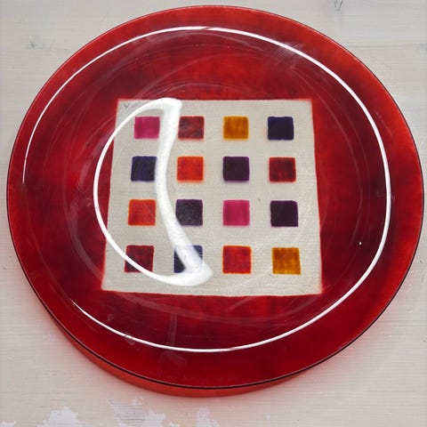 Glasskål med lilla dekor, laget i klart glass med lilla mønster. Skålen har en rund form og en fotet base. Egnet til dekorasjon. Håndmalt, står underskrevet med Aud 90. Gis bort mot henting.