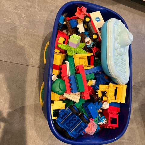 10 kg kasse med pent brukt Duplo. Diverse biler, fly, mennesker, dyr og blomster. Klosser og brett.