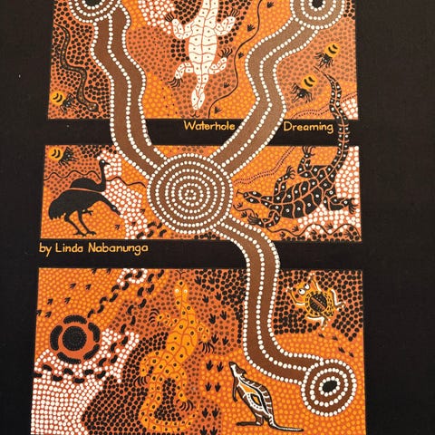 Sett med 4 aboriginsk kunstverk i rammer. Hvert kunstverk har unike mønstre og farger typisk for aboriginsk stil, dot painting. Rammene er svarte med hvit passepartout på de tre minste motivene. Passer til veggdekorasjon. Størrelse på hver ramme er 25x25 cm. Unummerert trykk. Kjøpt i Brisbane, Australia. Selges samlet for 1000 kroner.