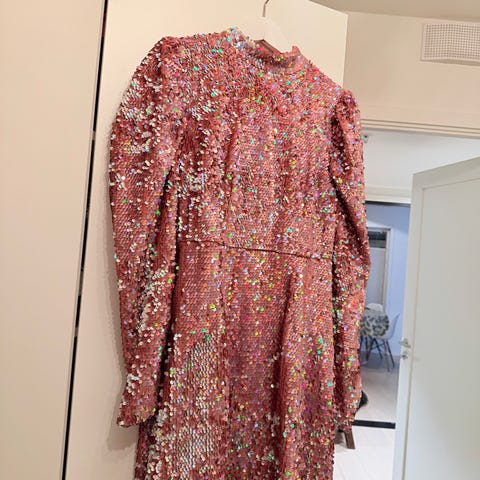 Saint Tropez joggebukser med paljetter i størrelse M. Laget av viskosemateriale med sølvfargede paljetter. Buksen har elastisk midje med snøring og ribbestrikkede mansjetter ved anklene. Perfekte disco-buksa!