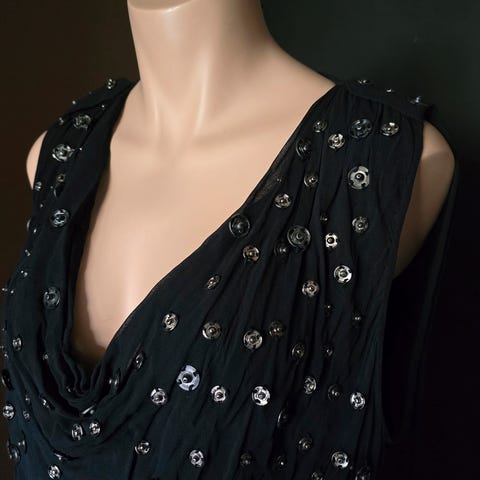 Veldig kul svart penkjole fra 2nd Day med nagler og "steiner" nedover oversiden av ermene og tøff synlig glidlås i ryggen. Gjennomsiktig stoff rundt halsen og undersiden av ermene.