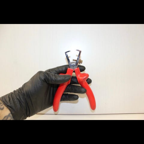 Automatisk avisoleringstang med røde og svarte håndtak. Verktøyet er designet for å fjerne isolasjon fra elektriske ledninger automatisk, og har en kompakt og praktisk utforming.