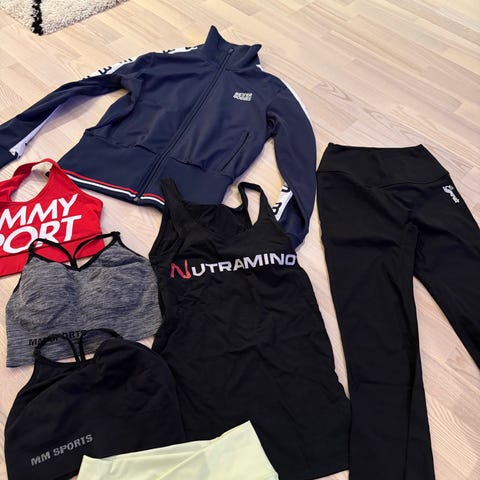 Pakken inneholder 2 svarte gensere, 1 treningsbh, 1 t-skjorte (denne er ikke fra famme), og en lilla tights.