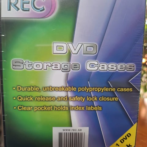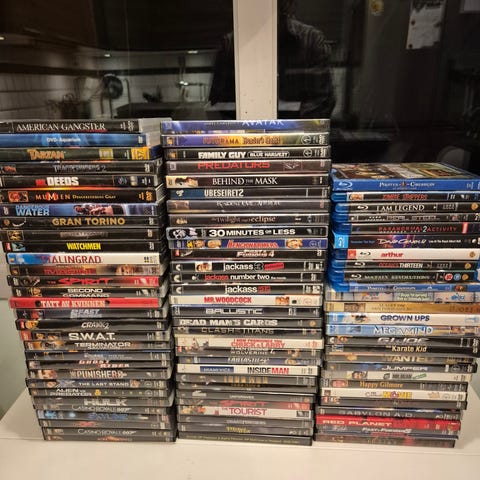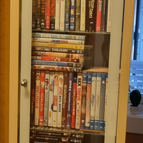 Skap med dvder og Blu-ray’s. Mange er fremdeles i plastikk.