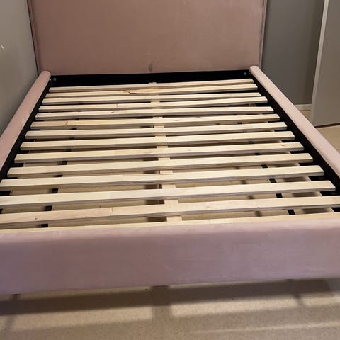 Med hode gavel, senge ramme, ribbebunn og madrassen.