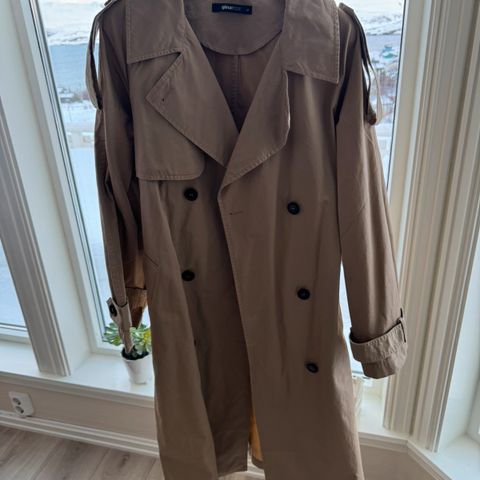 Gina Tricot kåpe størrelse M for kvinner. Jakken er hvit og laget av polyester. Den har knappelukking og en lang modell som dekker godt.