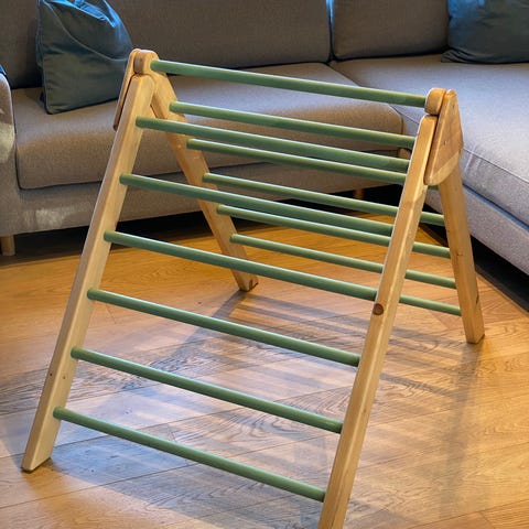 Pent brukt Montessori Pikler klatrestativ med tilhørende sklie fra MontessoriKidz. Solid og stødig konstruksjon i tre, perfekt for små barn som vil klatre, leke og utvikle motorikk.