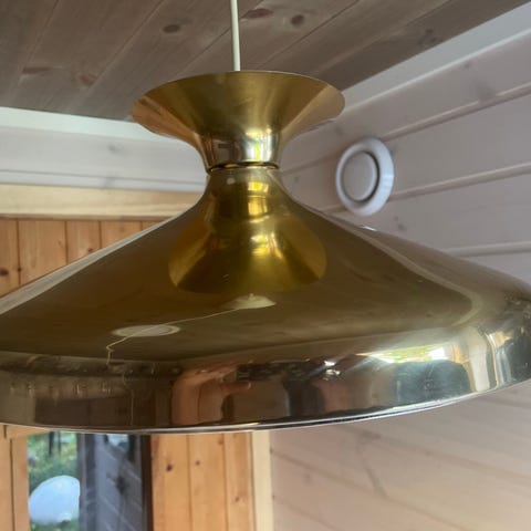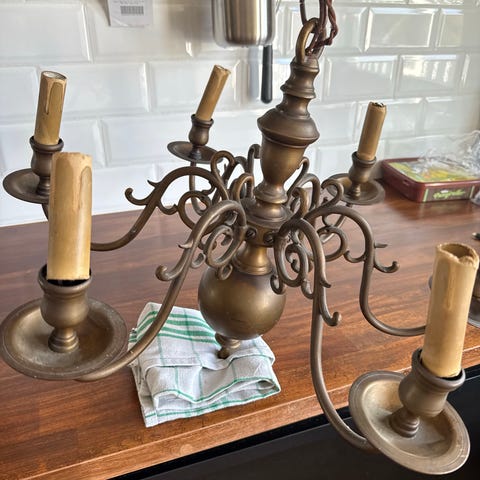 Stor, gedigen hengelampe i patinert messing i god stand. Den har 8 armer med E14 lyspærer. Høyde ca 65 cm, diameter ca 95 cm. Trolig fra ca 1935, ledningene er trukket om.