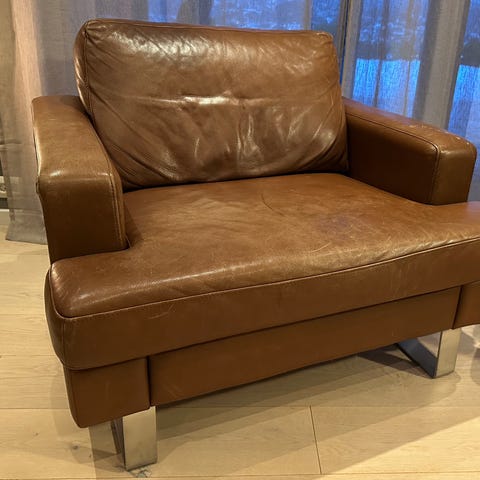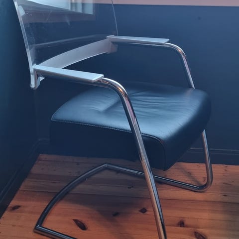 Fire stk. designerstoler i svart kvalitetsskinn. Produsert i Sverige av Centrum Design Sandin & Bülow. Modell Materia. Stolene har stått på et ledig rom og er nesten ikke brukt. Fremstår som nye. De er svingbare ca. 30 grader. Sittehøyde 45,5 cm.