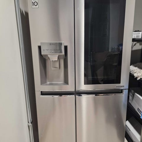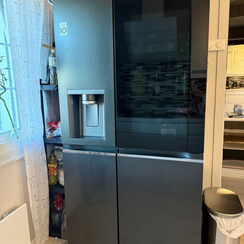 LG Side-by-Side kjøleskap med dobbel dør og innebygd isbitmaskin. Kjøleskapet har separate seksjoner for kjøling og frysing, og tilbyr god lagringsplass for matvarer. Passer for husholdninger som trenger stor kapasitet og praktisk tilgang til både kjøle- og frysedel.