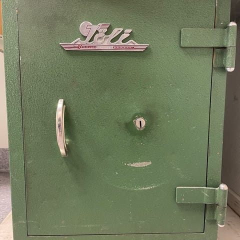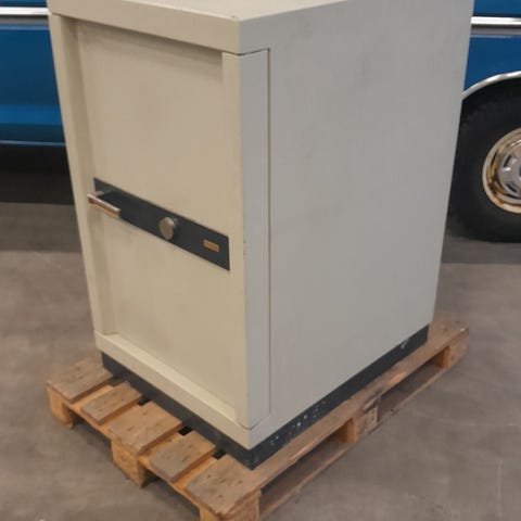 Jøli Safe Modell 4 hvelvskap i hvit farge. Skapet har en nøkkellås og inneholder flere oppbevaringsrom, inkludert en skuff med egen nøkkellås. Designet for brannsikker oppbevaring av verdisaker.