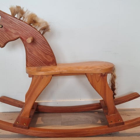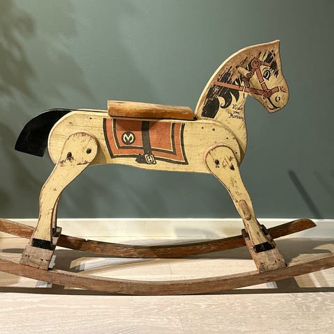 Gyngehesten er fra 1950-tallet. Den har holdt seg godt, noen få skrubb i årenes løp har det blitt. Velholdt, ingen skader.
