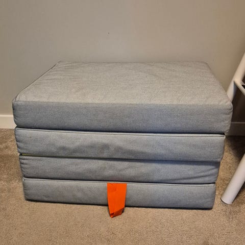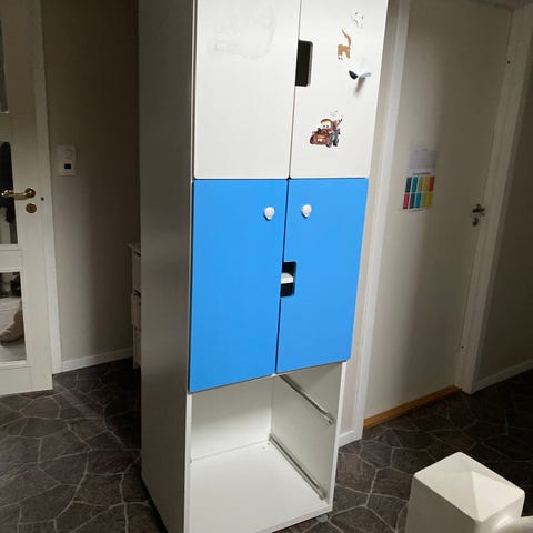 Gis bort dersom det begynner å bli lite plass på rommet og jeg bruker en slik en. Alt funker, den har hjul under. Det er merke på toppen i venstre hjørnet, der det satt noe form for teip/lim som tok av litt av malinga. Fram sida som nå er grå var tidligere rosa men ble malt over.