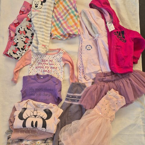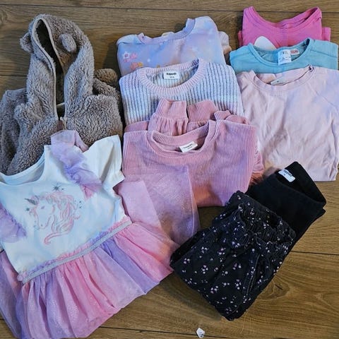 2 bukser, 3 tskjorter, 1 teddyjakke, 1 kjole, 2 gensere
