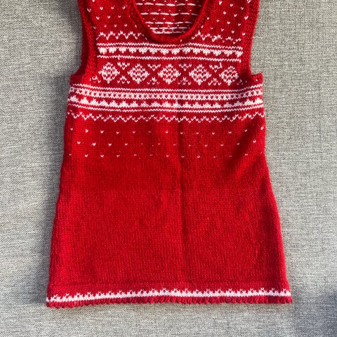 En nydelig hjemmestrikket ullkjole i merinoull i str 80 selges, samt en balaklava i tynn merinoull i str 74-80, selges samlet.
