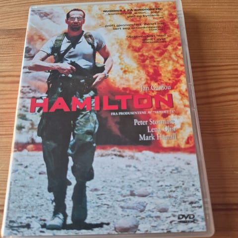 Hamilton DVD med filmcover som viser en person i militærtøy foran en eksplosjon.