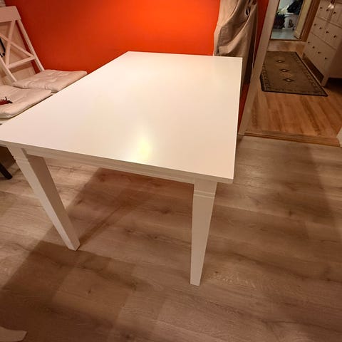 Hvit spisebord med 3 sorte glassplater. 2 ekstra klaffer til hver ende medfølger. Er 6 stoler som kan medfølge gratis. Den ene stolen er blitt veldig slitt i trekket.