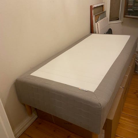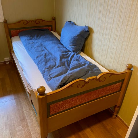 Tre sengeramme laget av treverk i enkel størrelse. Passer for en person og har en klassisk design med avrundede detaljer på hode- og fotende. Madrasser er inkludert. Prisen er 1000 kr per stk.