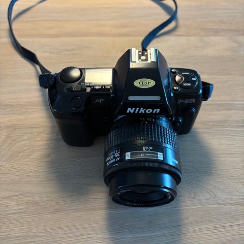 Nikon F-501 analogt kamera med manuell og autofokus. Dette kameraet har et klassisk design. Egnet selv for nybegynnere. Inkluderer blits. Lite brukt, ser ut som ny.