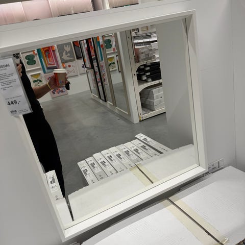 IKEA speil med enkel design. Speilet har et rektangulært format og en støttende base som gjør det egnet for plassering på bord eller gulv.