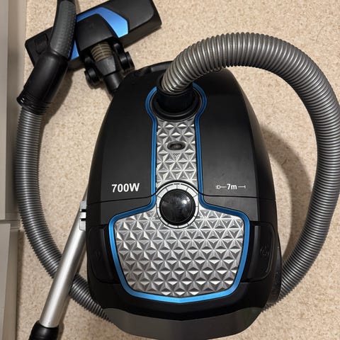 Godt brukt, men solid støvsuger selges pga overgang til en mindre en. Den har noen skrammer på det mest brukte munstykket, men bærer ikke preg av det i sin funksjon.