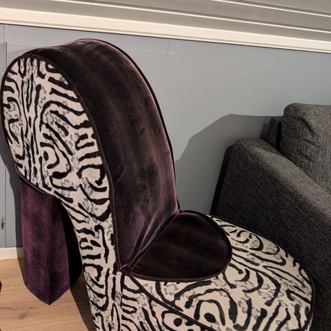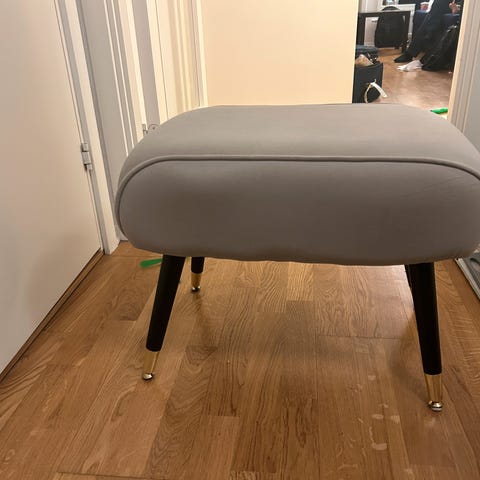 Selger en moderne sofa/puff i mørk grå farge med solide metallben.