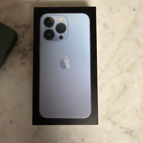 Apple iPhone 13 med 128 GB lagringskapasitet i blå farge. Telefonen har synlige skader på skjerm og bakside, inkludert sprekker. Produktet leveres som vist på bilder. Fungerer som det skal .