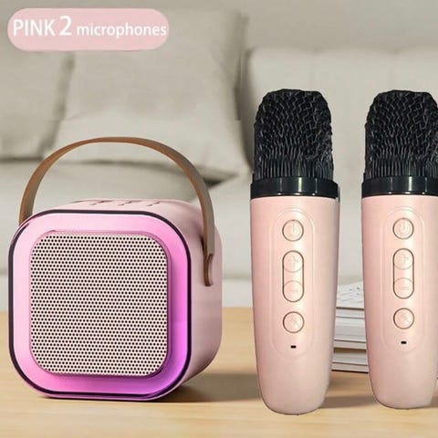 Et portabelt karaokeanlegg utstyrt med to trådløse mikrofoner - har fargerike discolys, et oppladbart litiumbatteri og USB-lading, noe som gjør det perfekt for familiesammenkomster, bursdager, Valentinsgaver.