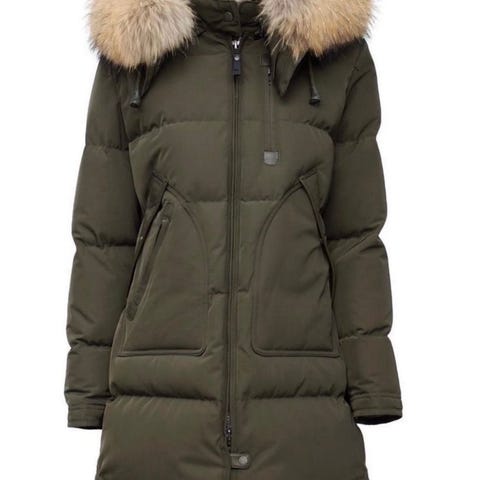 Jakken er svart og laget med dun som fyllmateriale. Den har hette med pelskant og lukkes med glidelås og knapper. Jakken har flere lommer og er egnet for kaldt vær.